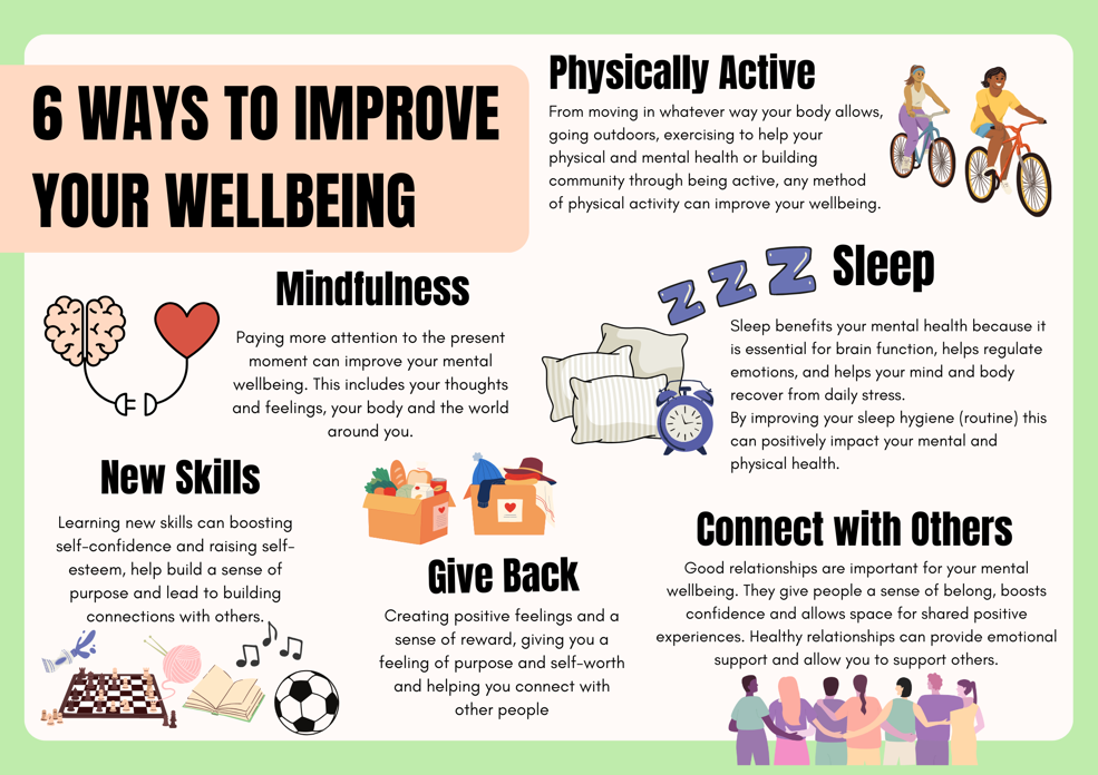 Wellbeing is not just the absence of ill health, it includes the way people feel about themselves and their lives. Wellbeing is influenced by physical and mental health and has an influence on the experience and outcomes of different health conditions.